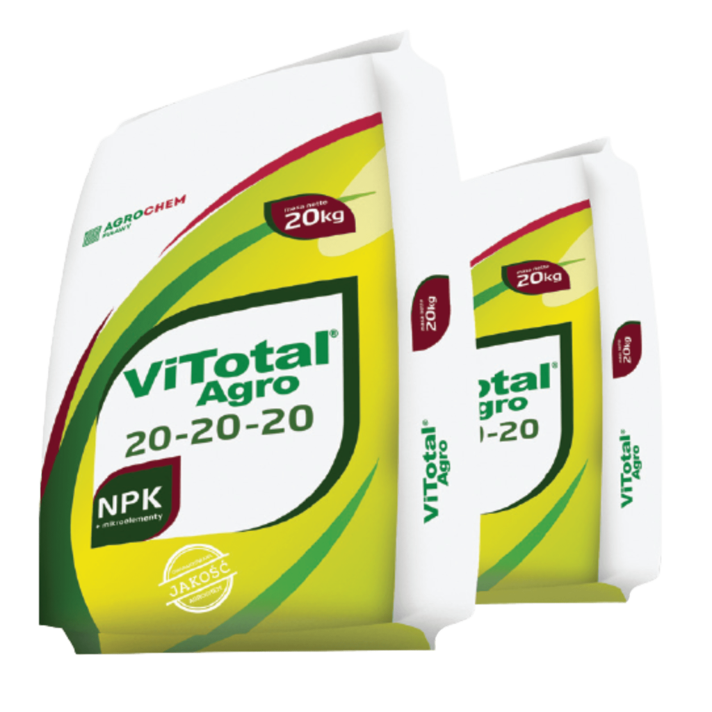 ViTotal Agro® NPK 20-20-20 to nawóz w postaci stałej, krystalicznej o zrównoważonym składzie NPK wzbogacony o magnez, siarkę oraz mikroelementy schelatowane EDTA. Całkowicie rozpuszczalny w wodzie, bezpieczny dla roślin, zalecany w całym okresie wegetacji. ViTotal Agro® NPK 20-20-20 przeznaczony jest do ogólnego zaopatrywania roślin w niezbędne składniki pokarmowe. Produkt znajduje zastosowanie we wszystkich roślinach uprawnych.